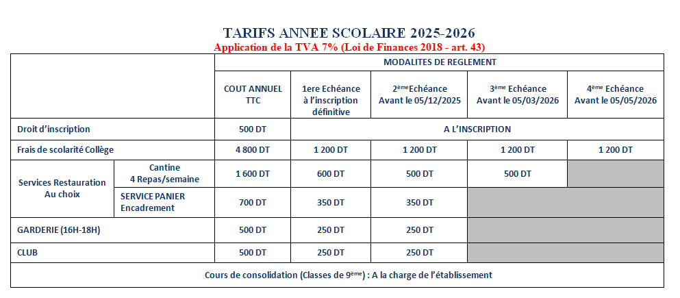 Les réservations doivent avoir lieu dès l’inscription. L’ouverture se fera le 1er jour de la rentrée scolaire. En cas de désistement, les droits et frais ne seront ni remboursables ni transférables à d’autres personnes ou à d’autres frais. L’absence de paiement dans les délais impartis entraîne l’exclusion temporaire de l’élève. La rentrée scolaire aura lieu le mercredi 17 septembre 2025 sauf modification opéré par le ministère de l’éducation. La réinscription de l’élève est obligatoire à chaque rentrée. Elle doit être effectuée au premier trimestre de l’année 2025. Au 31 mars 2026, l’établissement disposera librement des places des élèves non inscrits. La réinscription est soumise à l’accord préalable du conseil de classe de l’année précédente qui reste souverain. Elle peut être refusée pour raison disciplinaire. La réinscription d’un élève peut être refusée pour raison disciplinaire ou bien pour conduite irrespectueuse des parents vis-à-vis de tout membre de la communauté scolaire de l’établissement.